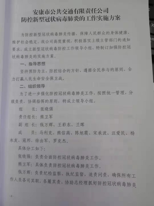 在節(jié)日前夕,公司召開疫情防控工作緊急部署會(huì),成立新型冠狀病毒肺炎防控工作領(lǐng)導(dǎo)小組,部署防控疫情工作,要求各部門要本著“嚴(yán)密防控疫情、確保春運(yùn)安全”的工作思路,全力以赴做好防控工作,發(fā)現(xiàn)問(wèn)題第一時(shí)間上報(bào),保證公交乘車環(huán)境安全。
